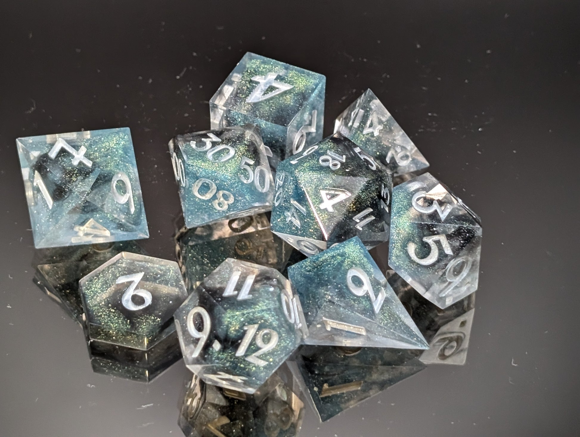 A set of 9 custom dice including a D2, 2x D4, D6, D8, D10, D100, D12, D20.